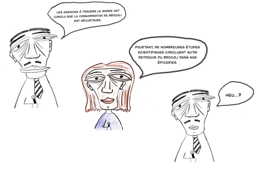 Aaaah, cette bonne vielle technique du doute et du supposé manque de recherche pour évaluer les risques (industrie du tabac, sors de ce corps). Je me répète, je sais, mais le risque zéro n’existe pas et avoir la certitude qu’un produit est inoffensif relève de l’impossible. C’est vrai pour le brocoli, le glyphosate, l’huile de lavande, le café, le lait de soya, les tisanes, l’huile de coco et j’en passe et des meilleurs… Encore une fois, les études épidémiologiques prospectives qui ont suivi une tonne d’agriculteurs pendant de longues années n’arrivent pas à déceler une augmentation de risque chez les utilisateurs. Pourquoi ces études (AHS et cohorte Agrican) ne sont-elles jamais mentionnées dans le reportage de la Semaine verte? WHY???