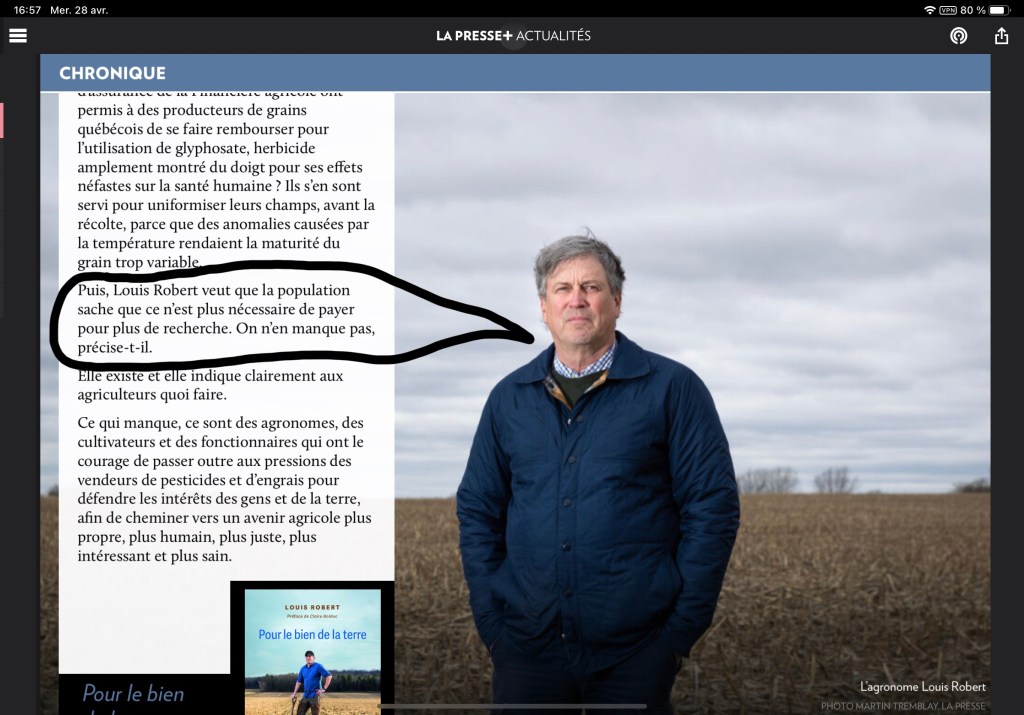 Alors ce Louis Robert, Don Quichotte ou héros national? Encore une fois, distinguons l’homme de terrain et l’homme médiatique (et auteur). On a bien sûr le droit d’utiliser de façon péjorative des mots comme productivisme, agriculture industrielle, OGM et intrants de synthèse sauf que cela demeure des positionnements idéologiques: aucun de ces concepts ou mots n’est intrinsèquement bon ou mauvais. Ce qui nous amène à revoir cette image de lanceur d’alerte qui aurait été bâillonné par les forces obscures. À défaut de connaître tous les détails de l’histoire, difficile de donner entièrement raison ou tort à Louis Robert. On peut comprendre qu’un agronome aux positions anti-industrie soit surveillé de près par le privé. À voir la propension de Louis Robert à dire parfois un peu n’importe quoi, on peut se douter que le privé ne perd pas une occasion de le mettre dans l’embarras auprès de son employeur question de rappeler l’agronome à l’ordre. À l’employeur de juger de la validité de la plainte.