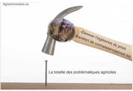 Autre problème, lorsqu’il nuance ses propos, Louis Robert se contredit souvent. Il a dit à plusieurs reprises que la recherche en agriculture n’était plus nécessaire, puisque nous avions suffisamment de solutions qu’il suffisait d’appliquer. Plus besoin de recherche en agriculture???