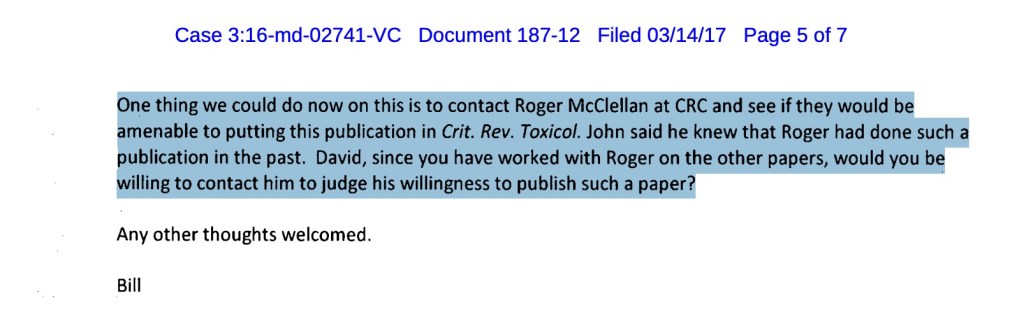 Ce qui ressort de ce courriel, c’est surtout un département de Monsanto chargé de préparer une revue narrative qui cherche à réduire les coûts de rédaction. Ce type d’organisation du travail est répandu dans les secteurs pharmaceutique et phytosanitaire. Dans ce cadre, les employés de l’entreprise sont bien placés pour compiler et résumer des volets davantage descriptifs et standardisés, comme l’exposition, la toxicologie et la génotoxicologie. Les sections plus interprétatives et potentiellement controversées, comme l’épidémiologie et les mécanismes d’action, sont plutôt confiées à des auteurs externes ou indépendants. Bref, c’est exactement ce que proposent les deux employés de Monsanto dans cet échange.