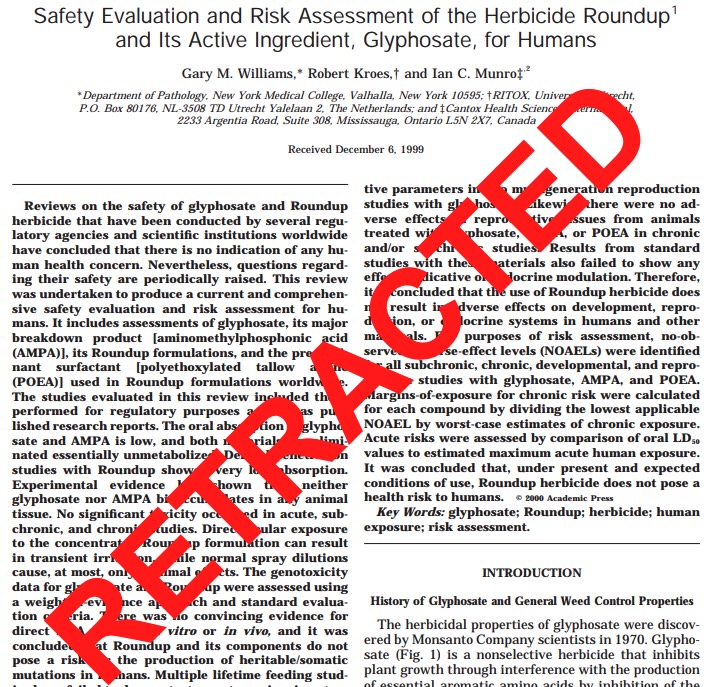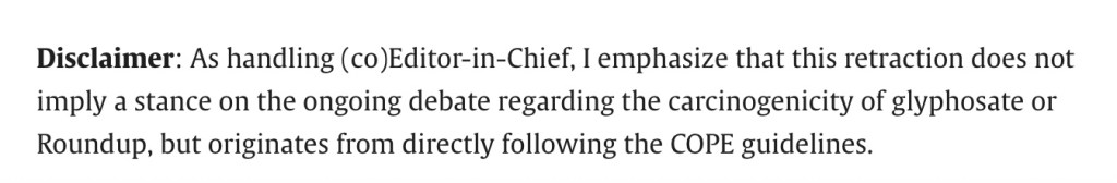 On mentionne très clairement en bas de la note de l’éditeur que la rétractation de cette revue n’implique aucune prise de position dans le débat en cours sur la cancérogénicité du glyphosate ou du Roundup, mais qu’elle découle strictement de l’application des lignes directrices du COPE.