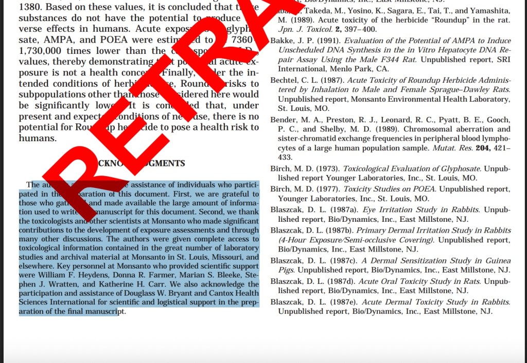 Voilà pourquoi ces « révélations » ne suffisent pas à eux seul: les agences de santé publique jugent les données, pas les querelles éditoriales. Les agences de réglementation étaient d’ailleurs bien au courant de l’implication de Monsanto dans cette revue narrative, car dans la section remerciement de la revue, il est écrit noir sur blanc que les auteurs remercient les toxicologues et autres scientifiques de Monsanto qui ont apporté des contributions importantes à l’élaboration des évaluations de l’exposition, ainsi qu’au travers de nombreuses autres discussions. Autrement dit, si l’objectif était de manœuvrer dans l’ombre, disons que c’était une stratégie audacieuse : un complot si bien dissimulé qu’il s’affiche… à la fin du papier, dans les remerciements.