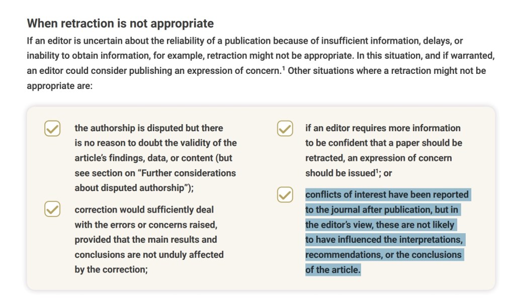 Ce qui a pesé ici, c’est que l’éditeur considère qu’il est raisonnable de croire que les co-auteurs non divulgués aient pu jouer un rôle dans le choix des études citées, combiné au fait que le dernier auteur encore en vie n’a pas répondu aux questions de l’éditeur.